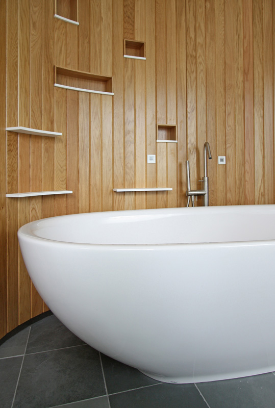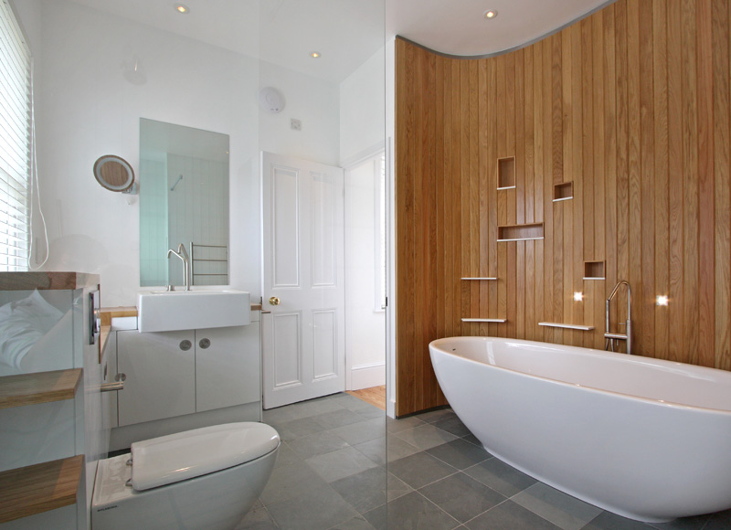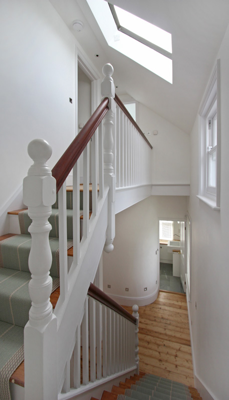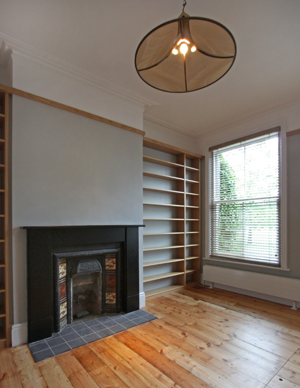 The building’s status in a prominent location within a conservation area meant that careful consideration was needed to the period features and details. The front bay was completely rebuilt, with specialist stonemasons replicating the original carved stonework, and specialist modern timber sashes were commissioned to replicate the originals while providing improved thermal performance. Internally, the rooms of the original house were stripped back and their original features preserved and repaired, creating a formal drawing room for entertaining and mature study at ground floor.