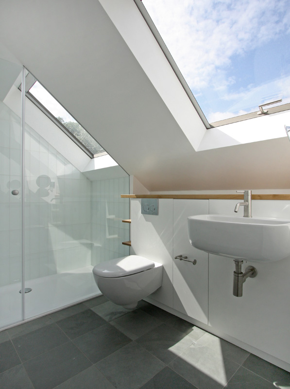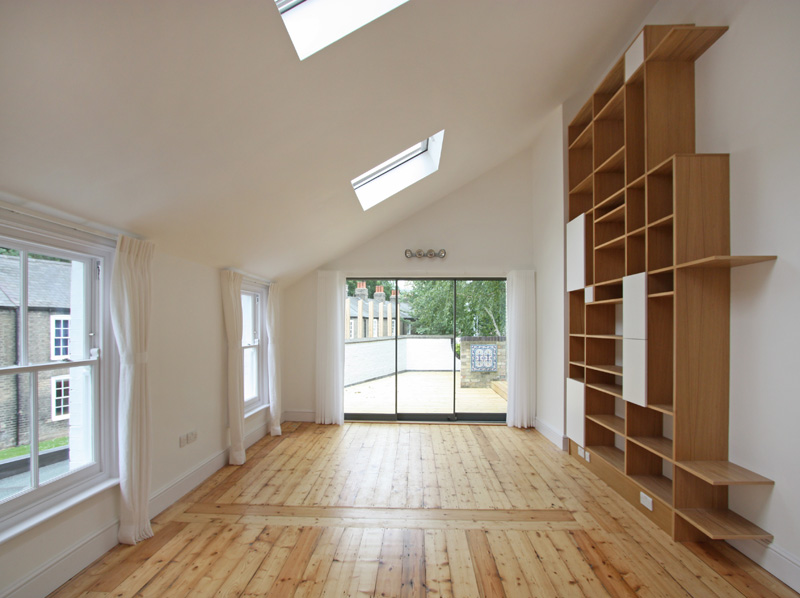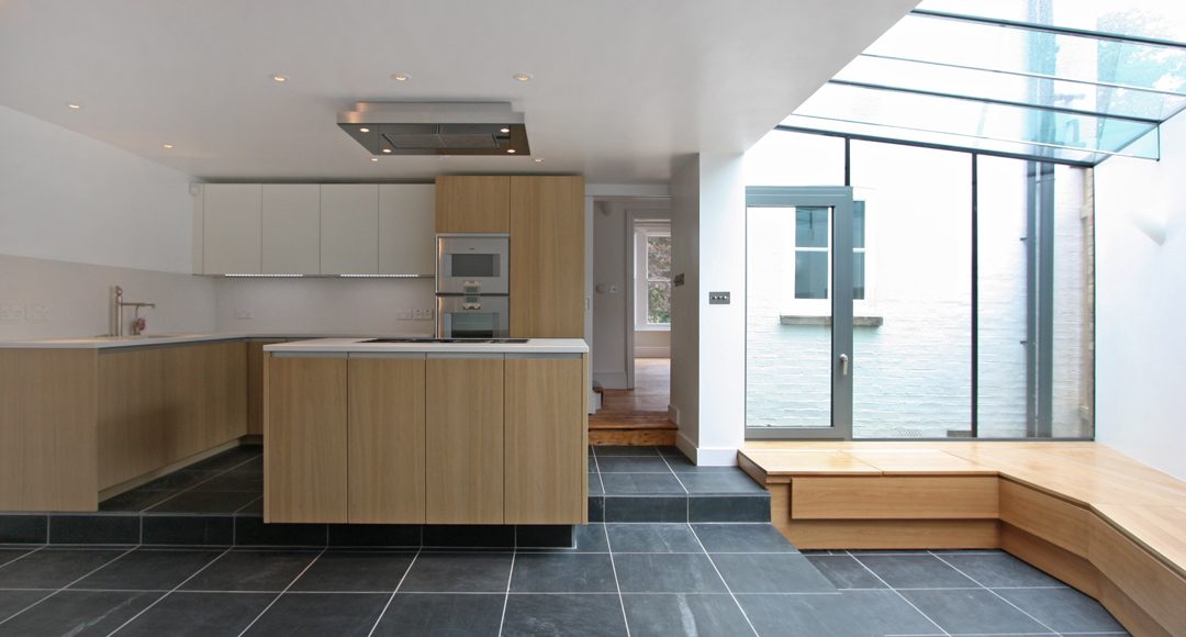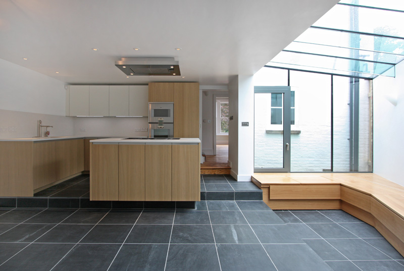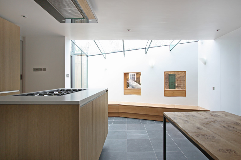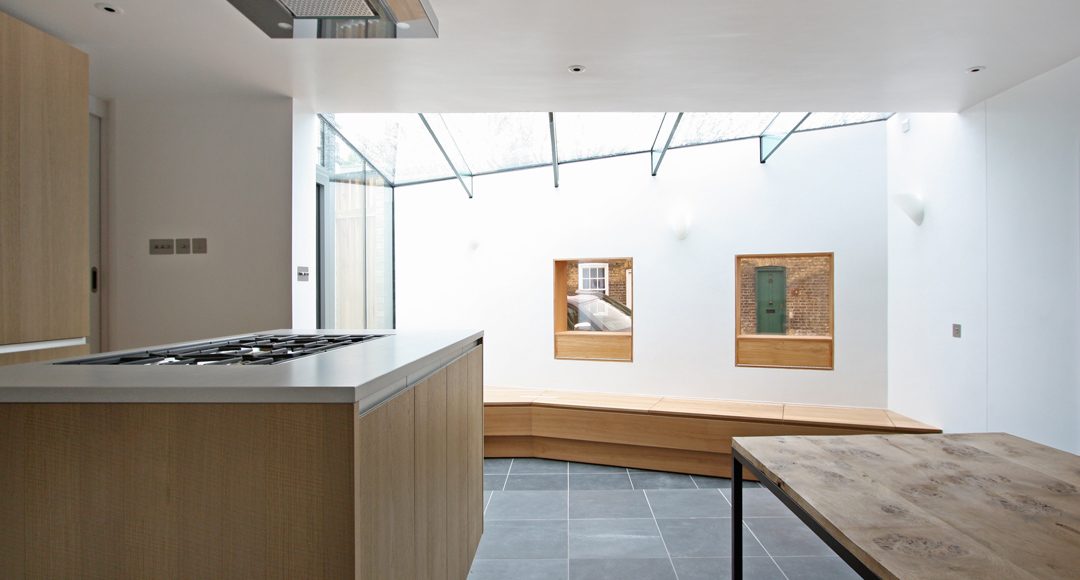 To the rear of the property a poor quality modern addition allowed for a more radical approach. A modern kitchen has been added with a glass courtyard room replacing an unused and overlooked yard. Above this a relaxed family room connects to an external terrace above the existing garage.